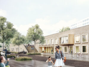 Sowohl Materialität als auch Farbgestaltung werden sich an der Umgebung und dem Neubau des Stadtteilhauses orientieren. Als Kontrast zu der hellen Klinkerfassade werden im Außenraum vorrangig anthrazitfarbene Materialien verwendet. Mit Hilfe einiger Ausstattungselemente werden farbliche Akzente gesetzt.